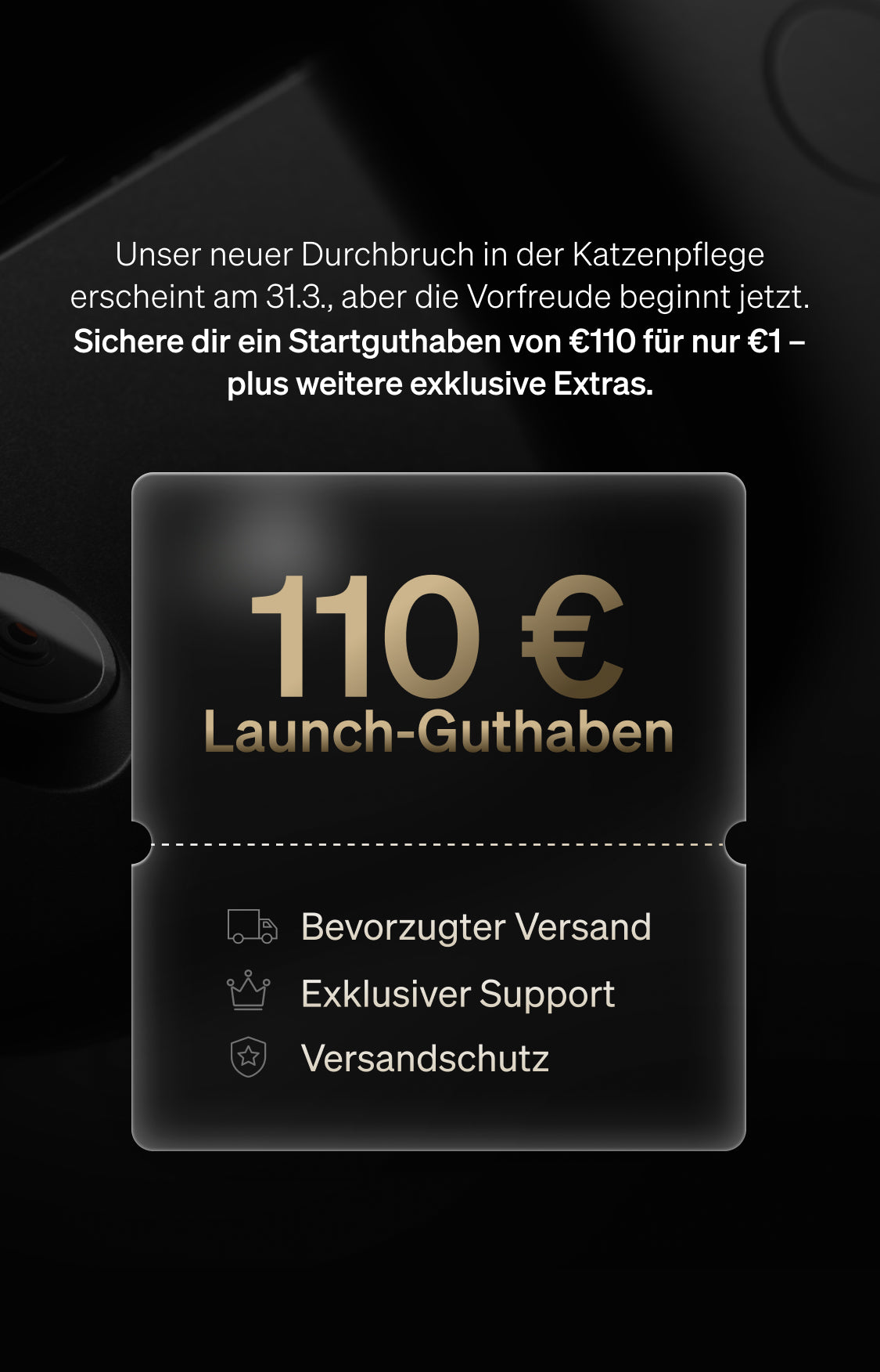 1. Das 110 € Launch-Guthaben wird als spezieller Gutscheincode an die beim Bestellvorgang verwendete E-Mail-Adresse gesendet. Kunden können diesen Code verwenden, um das neue Petlibro-Produkt nach seiner Markteinführung am 31.03.2026 mit einem Rabatt von 110 € zu erwerben.