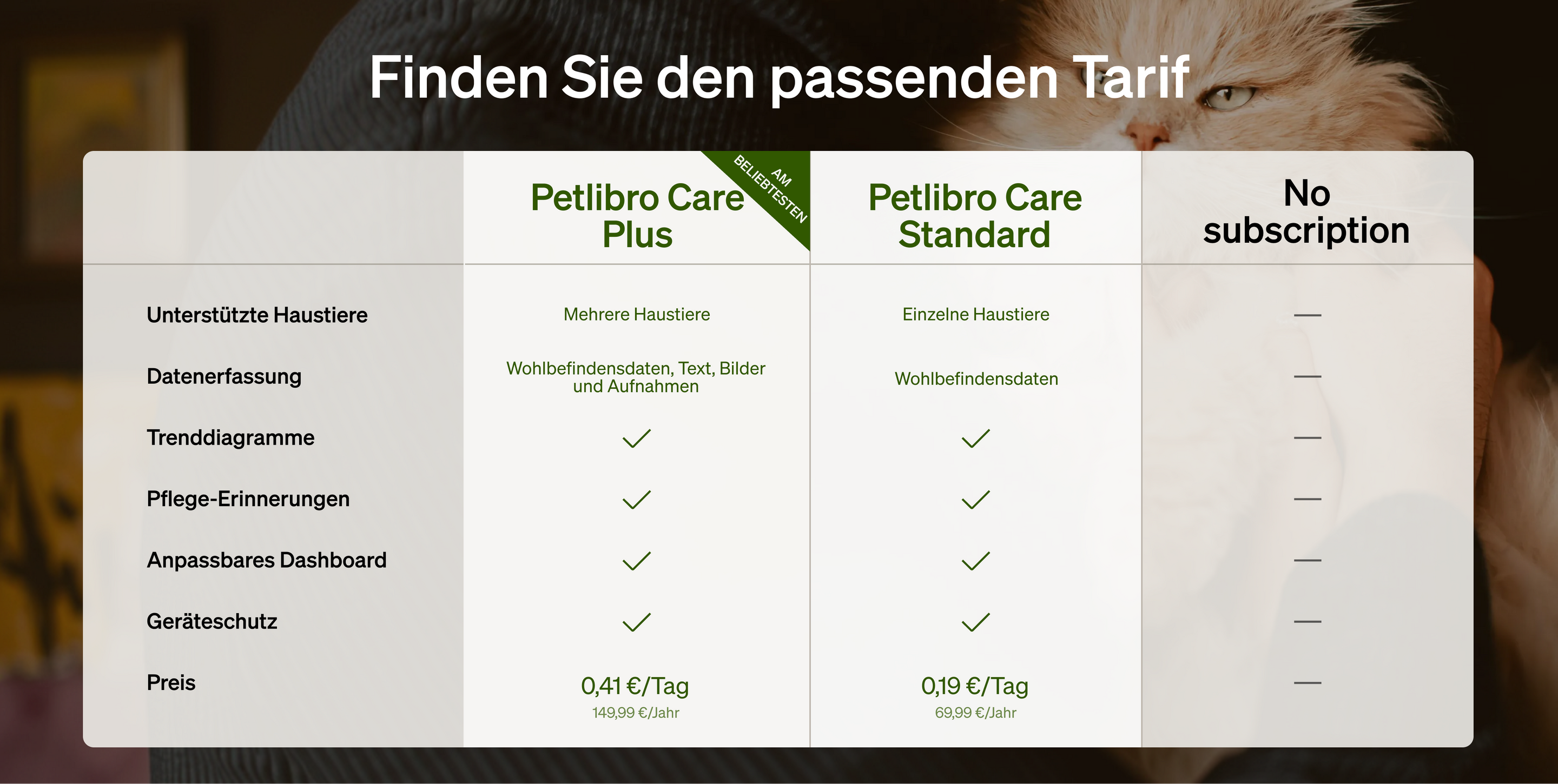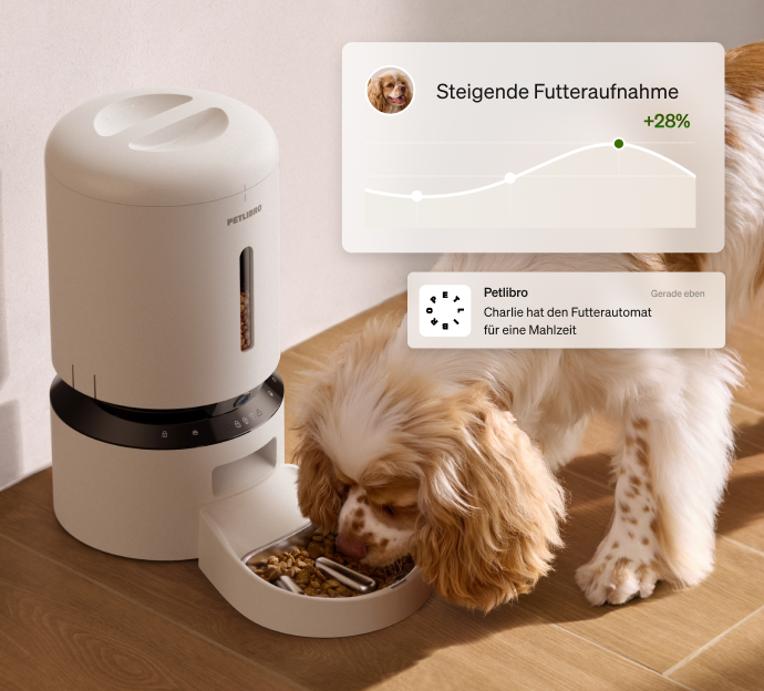 A: Mit einem Abonnement hilft Ihnen Petlibro Care dabei, die tägliche Futter- und Wasseraufnahme Ihres Haustiers zu verfolgen, bietet gemeinschaftsbasierte Referenzwerte für Fütterung und Flüssigkeitszufuhr und liefert Einblicke in das tägliche Verhalten und Wohlbefindens-Trends Ihres Haustiers.